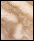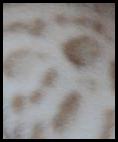 The Blue Bengal should exhibit an ivory or cream background with the blue spotted, rosetted, or marble pattern clearly visible. Spots shall be random, or aligned horizontally. Rosettes showing two distinct colors or shades, such as paw print shaped, arrowhead shaped, doughnut or half doughnut shaped or clustered are preferred. The marble pattern should flow horizontally with rosetting and chain-like appearances. Contrast with ground color must be extreme, giving distinct pattern and sharp edges. Strong, bold chin strap and mascara markings desirable.